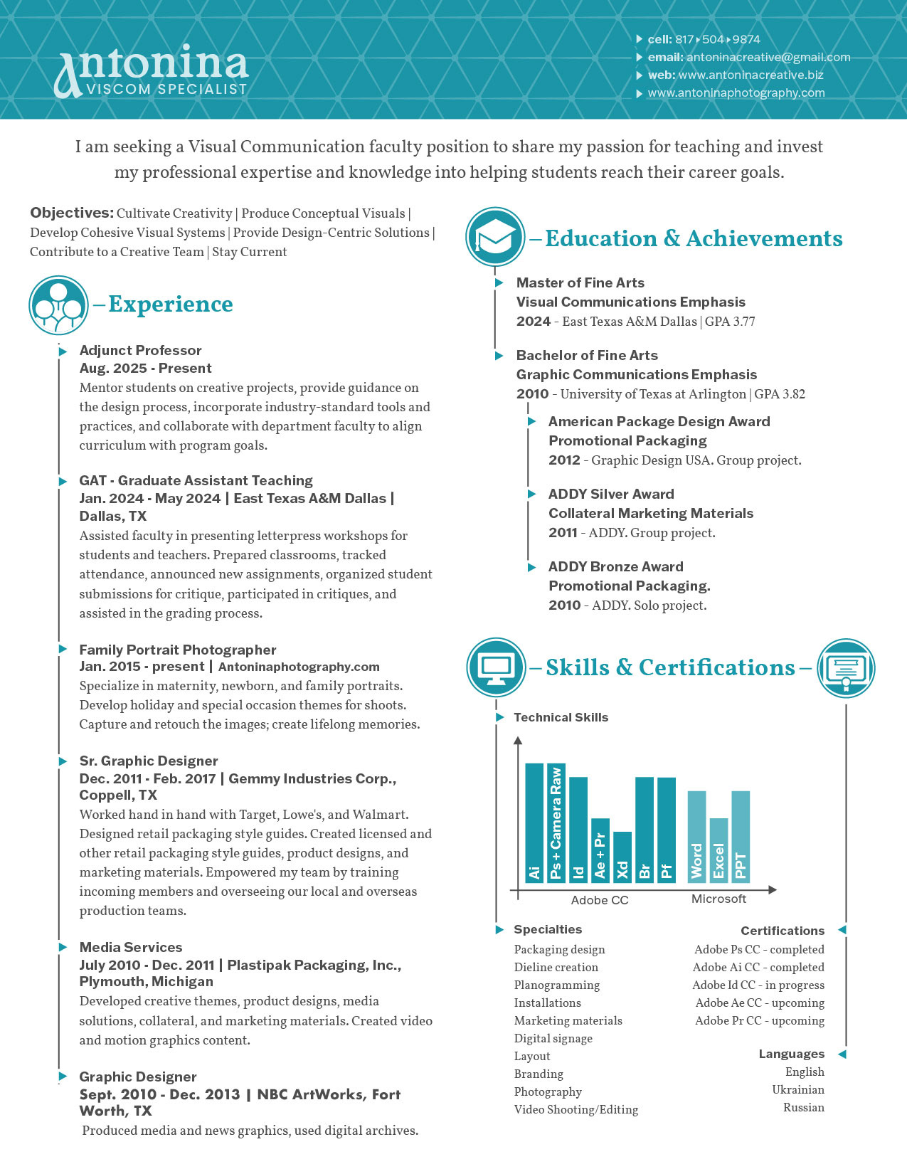“She was a fellow student in the MFA program at East Texas A&M University (former TAMUC) and a graduate assistant teaching (GAT) to me for a junior/senior level package design course I taught at TAMUC. In both capacities, Antonina delivered beyond the schoolwork and participation required in classes we attended; she also helped me prepare my packaging design class by providing guidance to students when requested.